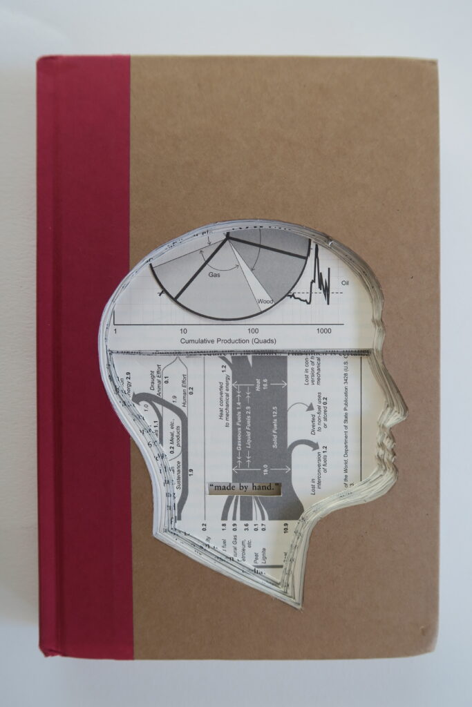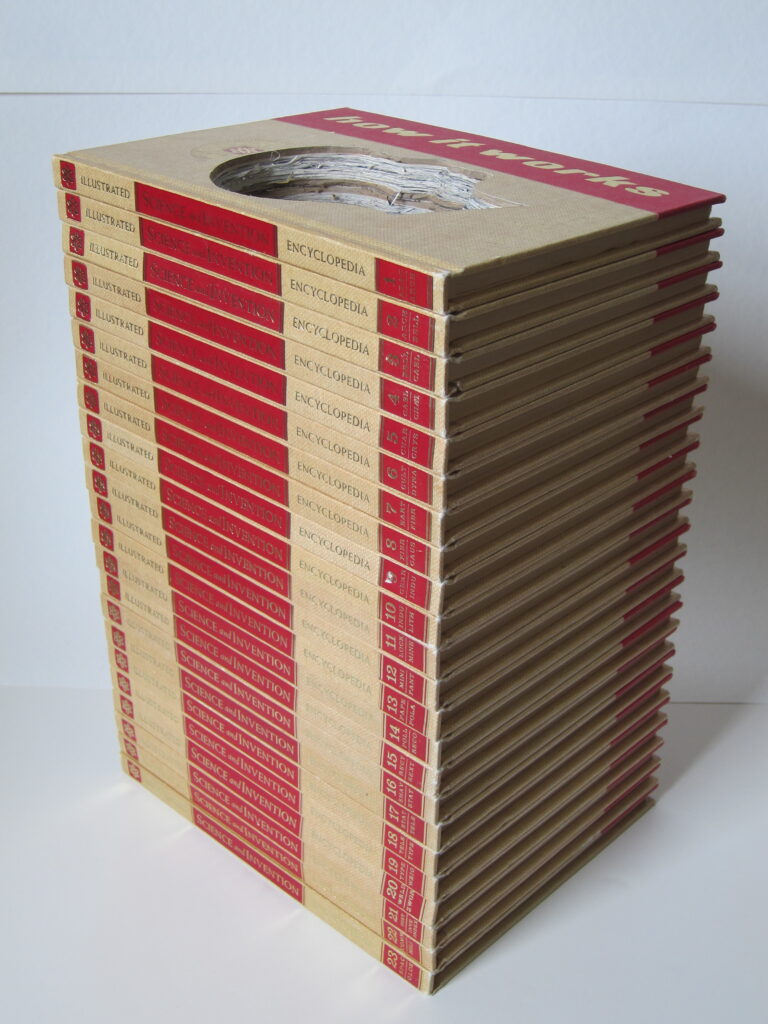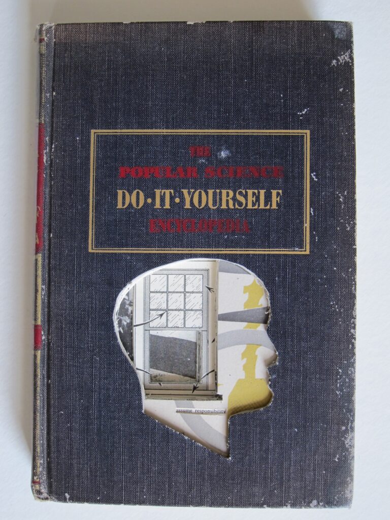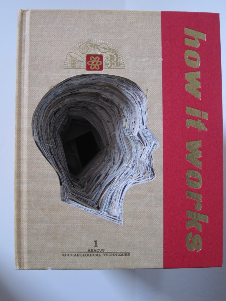 Works are created from books acquired from Library discards, thrift shops etc… I only use what I refer to as “information” based books, I believe information based books give data/information to process, investigate and use. The result of my investigations are presented through a portal, my profile. Everything exposed through the profile is in its original position in the book; material is not moved for better visual placement.The book is sealed so that it can no longer be opened.