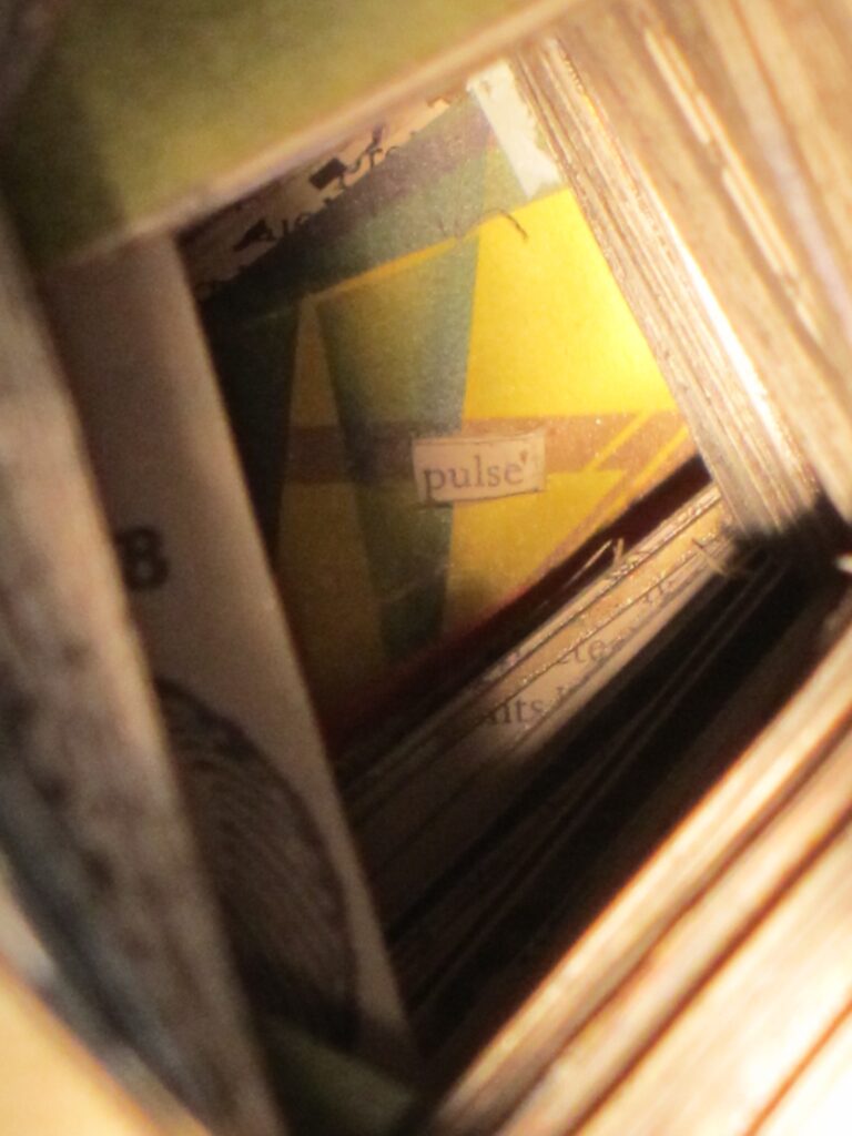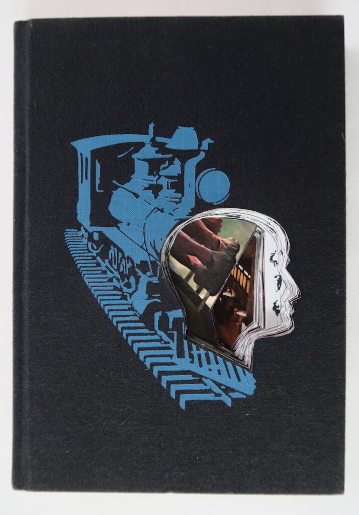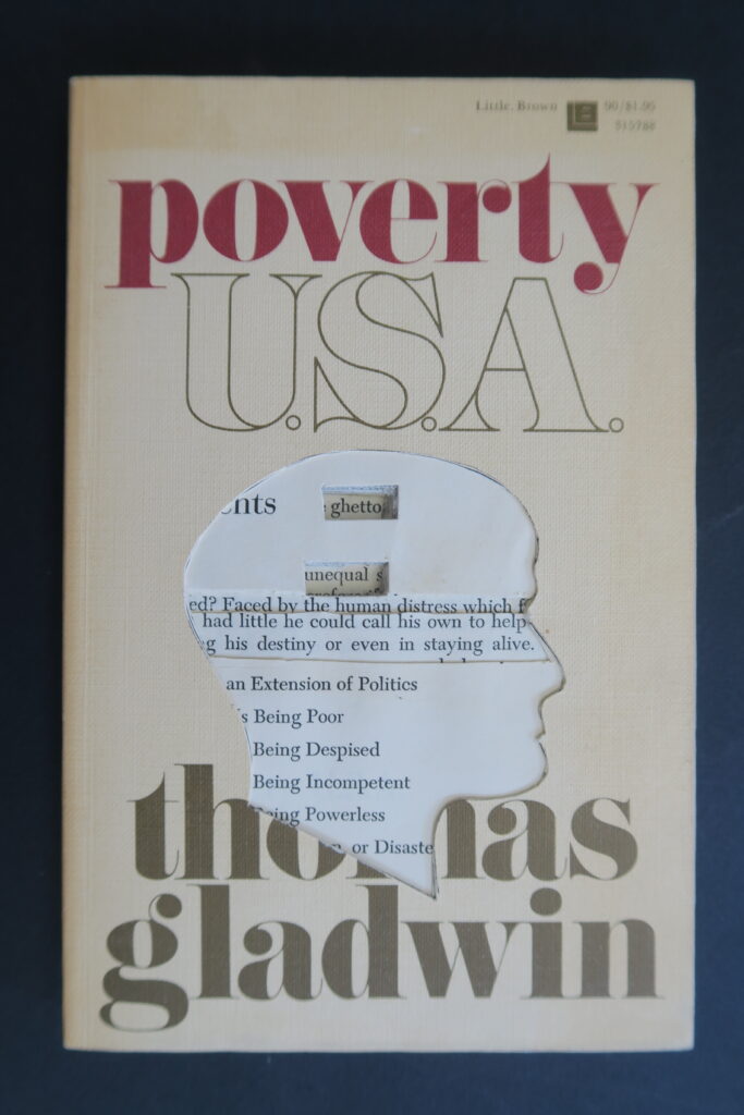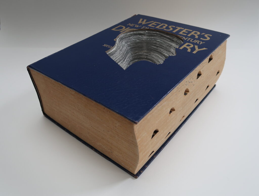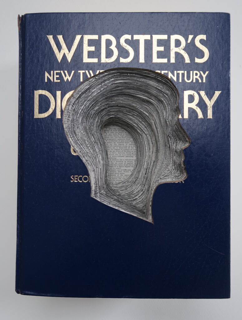Works are created from books acquired from Library discards, thrift shops etc… I only use what I refer to as “information” based books, I believe information based books give data/information to process, investigate and use. The result of my investigations are presented through a portal, my profile. Everything exposed through the profile is in its original position in the book; material is not moved for better visual placement.The book is sealed so that it can no longer be opened.