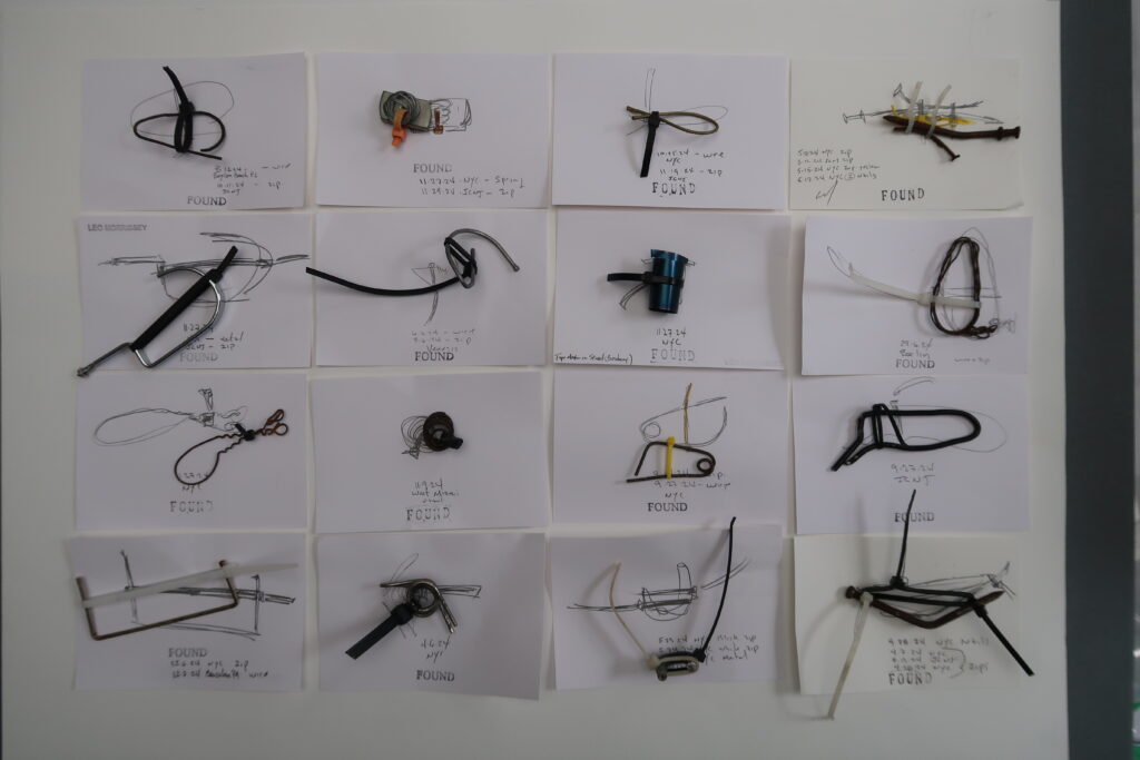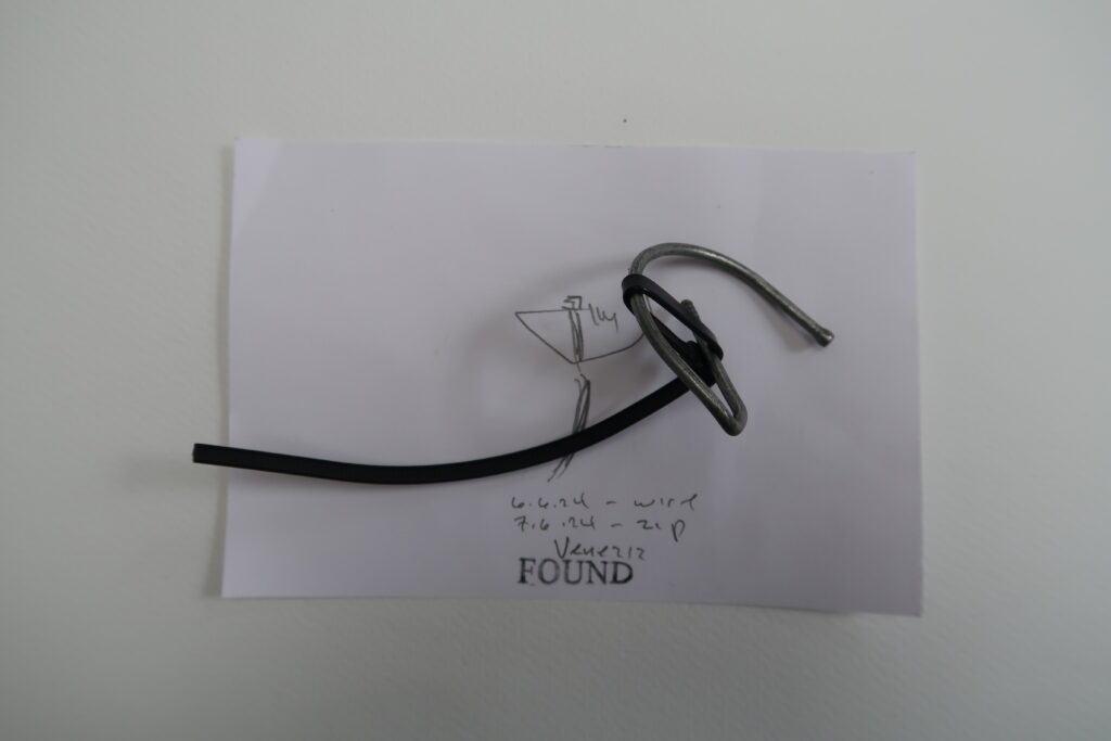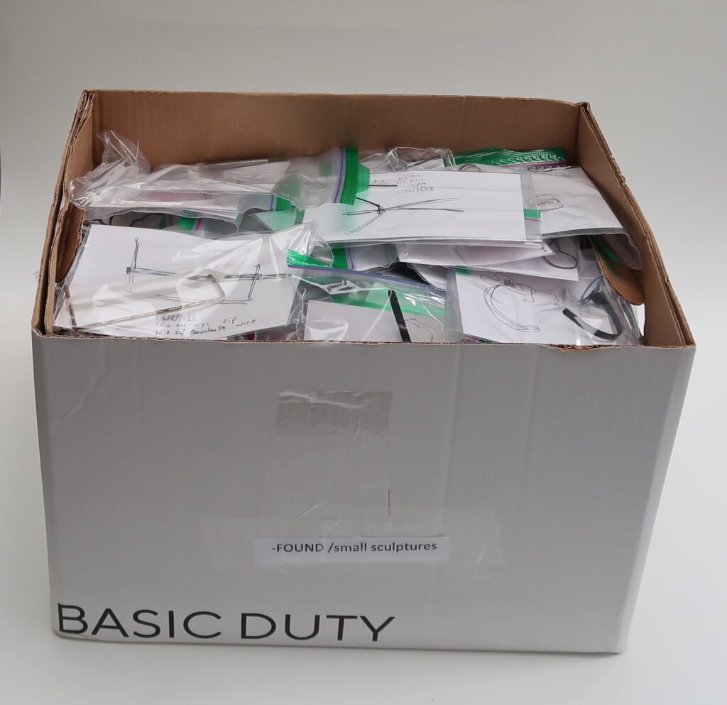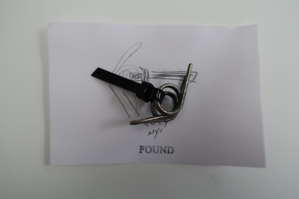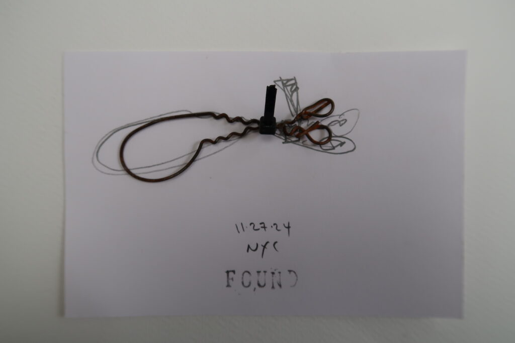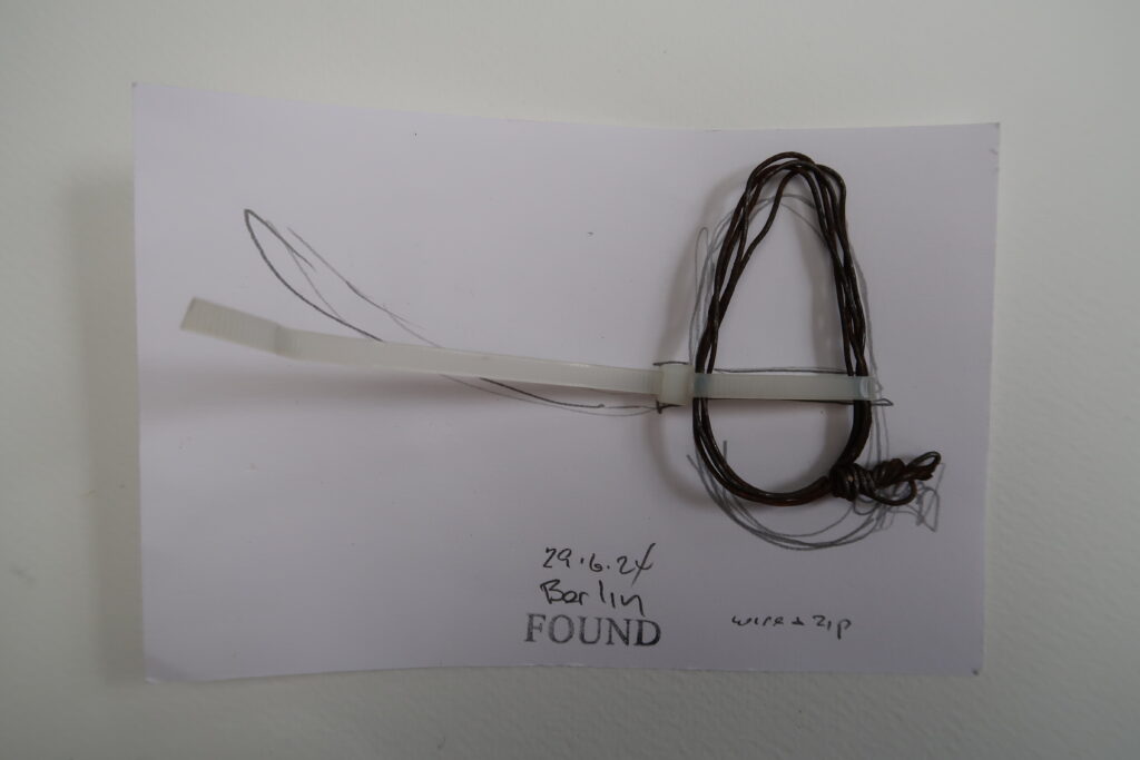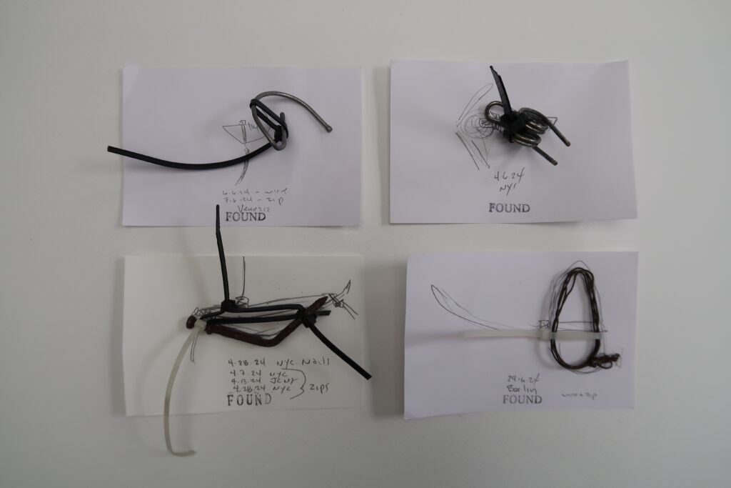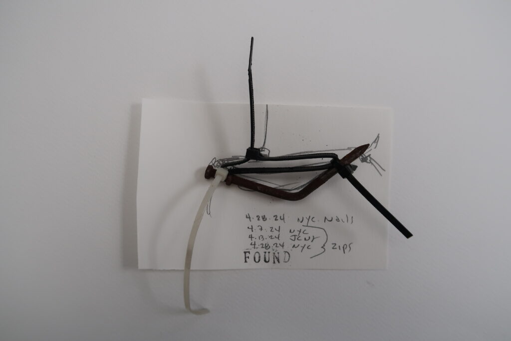 Works are created from objects found while walking. Each sculpture is made from metal & plastic cable ties. The works deal with constant & construction. Objects are found on various dates and locations (always recorded). A drawing of each sculpture is done on an index card, date, location & materials used noted, placed in a small bag & placed into a bankers box with the other sculptures. Objects have been collected over several years, and while traveling in Asia, Europe, Central & North America.